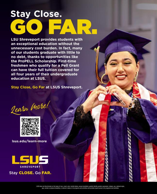Stay Close. GO FAR. LSU Shreveport provides students with an exceptional education without the unnecessary cost burden. In fact, many of our students graduate with little to no debt, thanks to opportunities like the ProPELL Scholarship. First-time freshmen who qualify for a Pell Grant can have their full tuition covered for all four years of their undergraduate education at LSUS. Stay Close, Go Far at LSUS Shreveport. lsus.edu/learn-more Stay CLOSE. Go FAR. LSUS does not discriminate on the basis of race, creed, color, marital status, sexual orientation, gender identity, gender expression, religion, sex, national origin, age, mental or physical disability, or veteran’s status in its programs and activities and provides equal access to its programs and activities. 318 FORUM /August 24 - September 6, 2022 PAGE 11