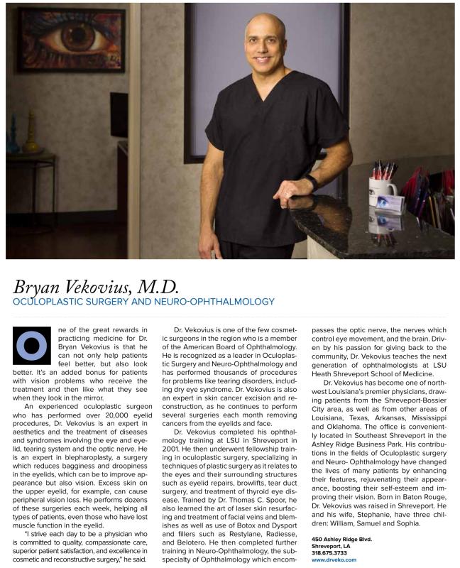 Dr. Vekovius has become one of northwest Louisiana’s premier physicians, drawing patients from the Shreveport-Bossier City area, as well as from other areas of Louisiana, Texas, Arkansas, Mississippi and Oklahoma. The office is conveniently located in Southeast Shreveport in the Ashley Ridge Business Park. His contributions in the fields of Oculoplastic surgery and Neuro- Ophthalmology have changed the lives of many patients by enhancing their features, rejuvenating their appearance, boosting their self-esteem and improving their vision. Born in Baton Rouge, Dr. Vekovius was raised in Shreveport. He and his wife, Stephanie, have three children: William, Samuel and Sophia.