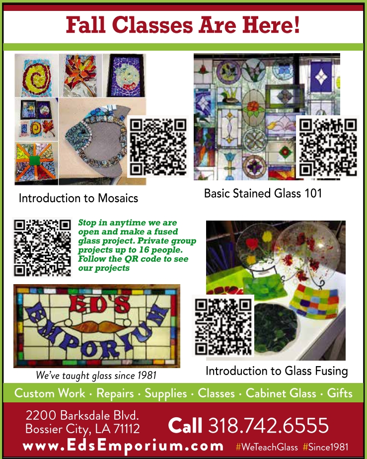 Fall Classes Are Here! Introduction to Mosaics Stop in anytime we are open and make a fused glass project. Private group projects up to 16 people. Follow the QR code to see our projects Basic Stained Glass 101 We’ve taught glass since 1981 Introduction to Glass Fusing Custom Work Repairs Supplies Classes Cabinet Glass Gifts 2200 Barksdale Blvd. Bossier City, LA 71112 www.EdsEmporium.com Call 318.742.6555 #WeTeachGlass #Since1981