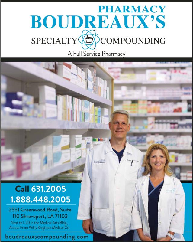 PHARMACY BOUDREAUX’S SPECIALTY A Full Service Pharmacy COMPOUNDING Call 631.2005 1.888.448.2005 2551 Greenwood Road, Suite 110 Shreveport, LA 71103 Next to I-20 in the Medical Arts Bldg., Across From Willis Knighton Medical Ctr boudreauxscompounding.com