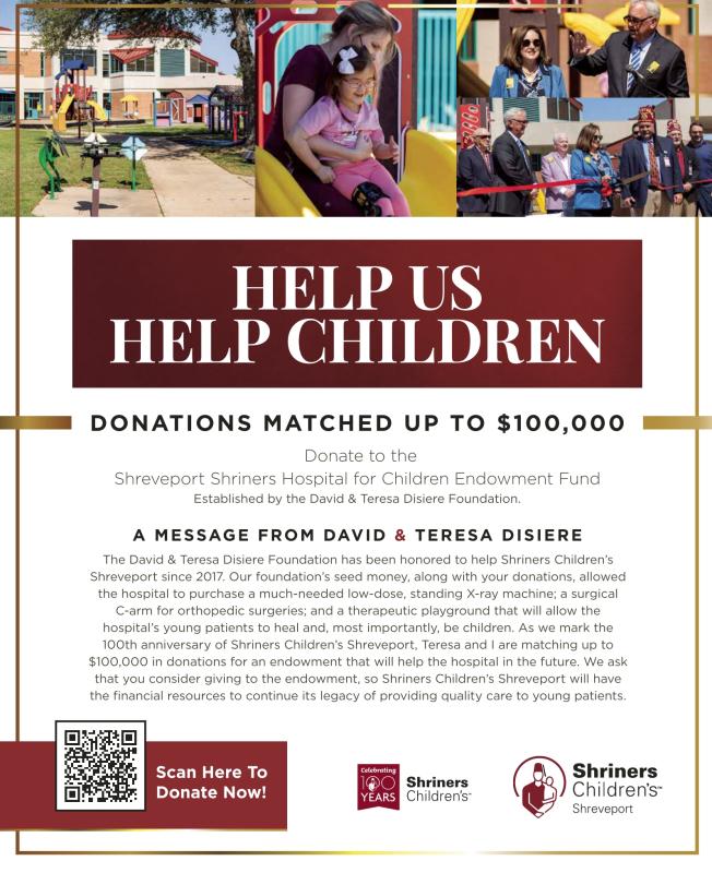 HELP US HELP CHILDREN D O N AT I O N S M ATC H E D U P TO $ 1 0 0 , 0 0 0 Donate to the Shreveport Shriners Hospital for Children Endowment Fund Established by the David & Teresa Disiere Foundation. A M E S SAG E F R O M DAVI D & TE R E SA D I S I E R E The David & Teresa Disiere Foundation has been honored to help Shriners Children’s Shreveport since 2017. Our foundation’s seed money, along with your donations, allowed the hospital to purchase a much-needed low-dose, standing X-ray machine; a surgical C-arm for orthopedic surgeries; and a therapeutic playground that will allow the hospital’s young patients to heal and, most importantly, be children. As we mark the 100th anniversary of Shriners Children’s Shreveport, Teresa and I are matching up to $100,000 in donations for an endowment that will help the hospital in the future. We ask that you consider giving to the endowment, so Shriners Children’s Shreveport will have the financial resources to continue its legacy of providing quality care to young patients. Scan Here To Donate Now!