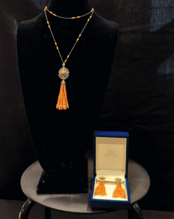 AUCTION Coral and diamond pendent necklace and earrings with a coral