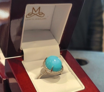 Ladies’ 18 kt. white gold and turquoise fashion ring with 124 tw. round diamonds.