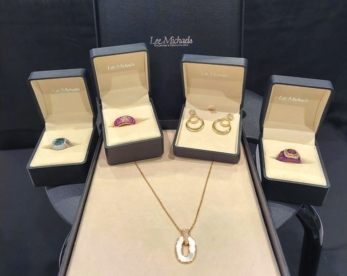 Live Auction Item: 18 kt. white gold and blue tourmaline with white sapphire diamond ring. Value: $11,500 Rose gold jeweled ring. Value: $2,300 Diamond and gold earrings. Value: $3,650 LSU Amethyst and diamond ring. Value: $1,700