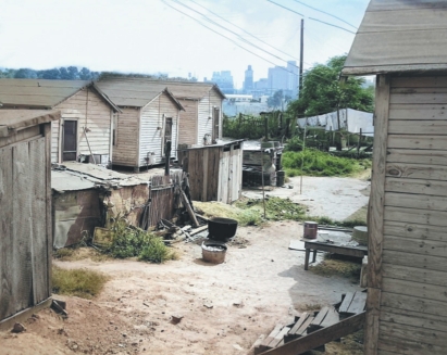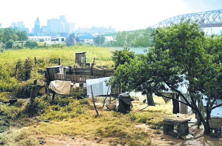 Crudely built shacks stand sentinel along the Bossier riverfront.