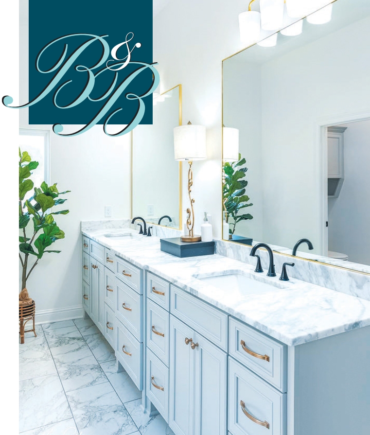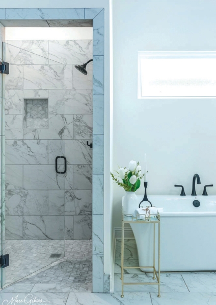 Varying shades of gray and white tile and marble and burnished gold hardware bring a feeling of luxuriousness to the master bath.