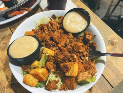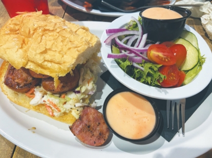 Half po-boy and salad. For my entrée, I chose the Half Po-boy & Salad ($11.99). I went with the gator andouille and a mixed green salad. (I could have chosen a traditional Caesar salad.) The menu described the po-boy as made up of gator sausage, slaw and house sauce. It had been a while since I had a po-boy, mostly because I don’t eat much bread. You know, when you order a po-boy, there will be a lot more bread than what’s on the inside. This po-boy wasn’t any different. The bread – Gambino’s French Bread – looked to have a little melted butter. It was good – not too tough, not too soft. My only complaint with the po-boy is that the eight pieces of gator sausage were not hot. While they weren’t cold, they weren’t warm, either.