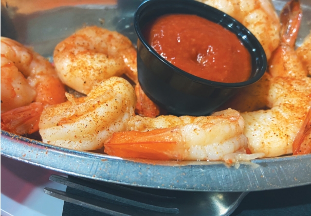 King cake cheesecake. Seven minutes after we sat down, Ozzy returned to take our order. BeauxJax’s menu isn’t overwhelming, but the focus is on shareables (think appetizers), salads and po-boys. Because I am also thinking of you, the reader, I insisted we start one of those shareables – the Jumbo Shrimp Cocktail ($10.99). The menu said the appetizer would consist of eight jumbo shrimp with cocktail sauce. I was surprised when it arrived, as I have always seen a shrimp cocktail served in some type of glass. However, this shrimp cocktail came in a non-glass serving bowl. The shrimp were seasoned and very tasty. However, BeauxJax’s use of the word “jumbo” was a bit of a stretch.