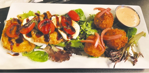 Our dinner began with an appetizer. There were several choices, but here again, The Library does something we really liked. Sure, you can order a full-size starter and share or request a couple of half-order starters – for half-price. That’s what we did, sharing the Crawfish Arancini ($6) and the Fried Green Tomato Caprese ($6).