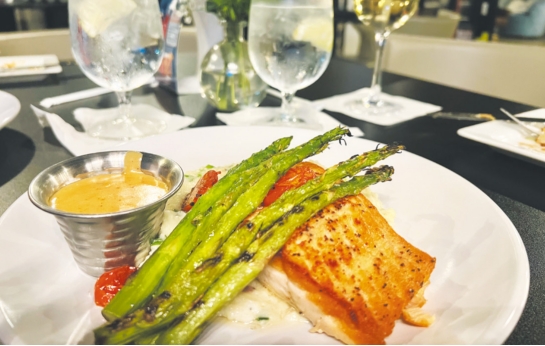Sauteed salmon with grits, goat cheese, asparagus and hollandaise sauce.