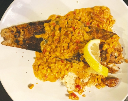 Pan-seared blackened redfish with stone ground grits and corn maque choux.