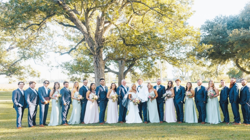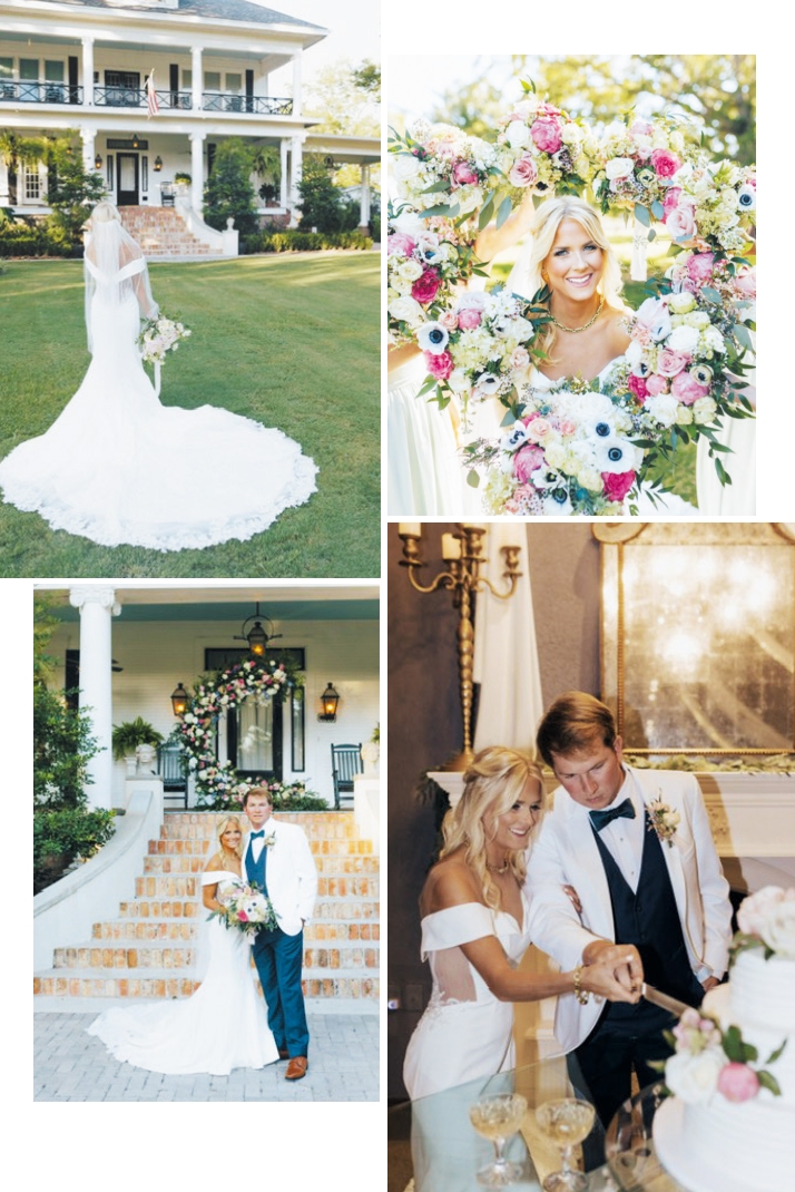 The reception, held indoors and out at Caspiana, was lively and fun. “As a bride, I think having a variety of food options and entertainment for our guests was special,” Blake Carby says, recalling the day. There was a cotton candy booth by Sugah Cotton Candy and Champagne Charlie’s Bubble Bar, a 360-photo booth from Skillzplus Entertainment Inc., and disposable cameras on tables outside to keep the guests entertained. As for food, the Uneeda Taco truck supplied guests with loaded nachos and tacos, barbacoa, carnitas with rice, street corn and beans. There was also a Johnny’s Pizza Truck offering cheese, sausage, and pepperoni; inside were crab claws, meat pies and shrimp from Cush’s. The groom’s and wedding cakes were from Royalty Sweet Shoppe, LLC.
