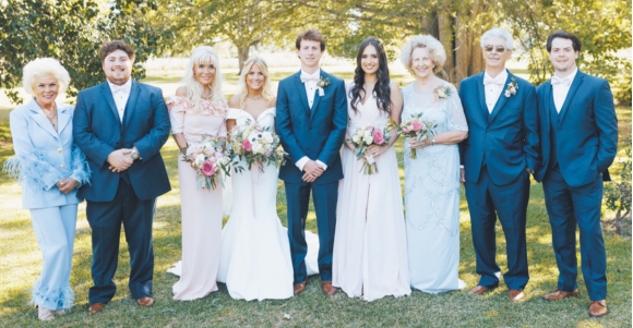 The bride wore a stunning off-the-shoulder gown with a fitted bodice that gave way to sheer lace around the sides and back. The mermaid-style skirt cascaded down to a full-length lace-edged train. The groom wore a white tuxedo shirt, blazer, navy pants, vest and bow tie. The groomsmen wore navy jackets and slacks with bow ties matching the bridesmaids’ dresses, individually styled in the most delicate shades of blush pink and dusty sage. The bridal bouquet and bridesmaids’ flowers, crafted by Sibling Stems, were a lovely combination of cream, dusty sage, white and blush pink in the form of hydrangeas, roses, anemones and luscious peonies surrounded by light touches of greenery.