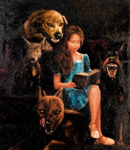 I was struck first by a dark, heavily veneered oil painting of a young girl looking down into a massive book