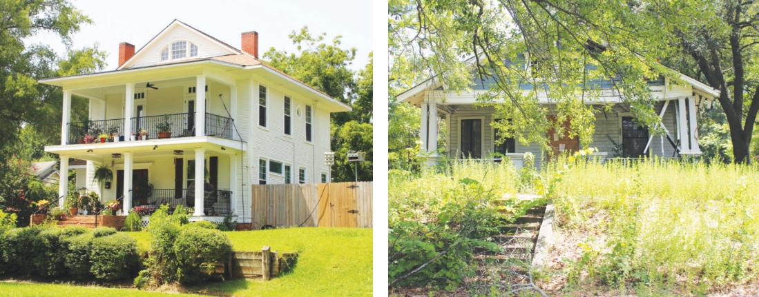 Beautifully maintained and restored properties may be only a few houses away from decay and neglect.