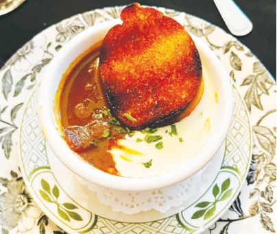 The signature soup at The Mabry House is roasted tomato and gouda ($8.95 for a cup, $11.95 for a bowl). The menu says this is “twin soups,” and that’s a fair description because it is presented in one vessel; however, the tomato part occupies half of the vessel while the gouda part resides beside it with a crostini as a sort of visual bridge. This presents a conundrum for the diner because a decision must be made about how to attack it. Does one alternate bites? Dip the spoon on one side and then the other? Stir it all up and blend the twins, if you will. My companion did all these things and expressed no opinion about which strategy worked best. She summed it up by saying, “This stuff is so good I could swim in it.” In that scenario, the crostini could serve as a flotation device.