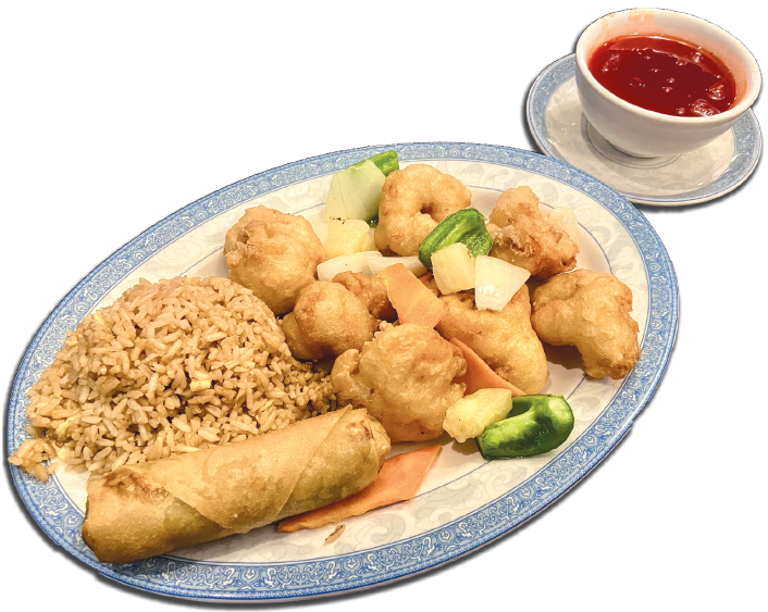 At Imperial Cathay, I’ve never waited long for my meal to be served, and this day was no exception. And, I would not have to send it back because it was not hot. Smoke came from the fried rice and shrimp after I took my first bite. Seven decent-sized shrimp were on my plate, topped with and surrounded by slices of bell pepper, pineapple and onions. There was a nice-sized serving of fried rice and a reasonably large spring roll.
