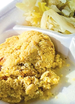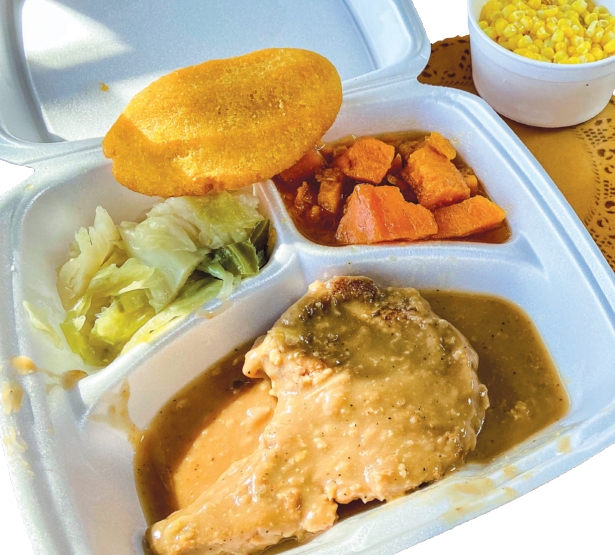 Fried chicken and sides That meant our choice of one entrée, three sides, and a piece of hot water cornbread. There was plenty from which to choose. For the main event, think fried pork chops, smothered pork chops, fried chicken, red beans and rice, and neckbones. Vegetable choices included turnip greens, yams, cabbage and corn. There was also dressing, mashed potatoes, and rice and gravy.