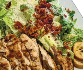 The lunch menu described four salads and 12 “Main Courses.” I prefer not to eat a heavy lunch, especially in the summer. I chose the rustic Caesar salad ($12). For an extra amount, I could add either grilled chicken, grilled shrimp or grilled New York Strip steak. I chose to add grilled chicken ($7).