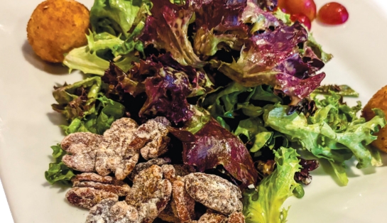 Her salad arrived first, as it should have, and the presentation was beautiful. There was an ample serving of greens in the center of the plate. Two corners of the plate each had a fried goat cheese ball. Another corner had sliced grapes, which looked very fresh. The final corner had what the menu described as “spice pecans.” However, I tried a few and didn’t taste any spice.