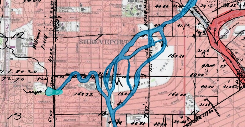This map shows how the Red River connected to Betty Virginia Park. The “Lagoon” refers to Deer Lake, which makes up most of the park. The dark blue is Bayou Pierre. Dark red shows the Red River. Line Avenue is the double vertical line splitting the lake. Cartography by Gary D. Joiner, Ph.D. Historical information is from portions of the original U.S. Government Patent Survey of Township 17 North, Ranges 13 and 14 West from the 1830s.