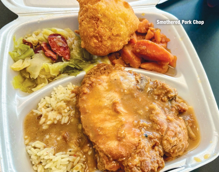 Yes! My food was outstanding! Not only was the pork chop huge, but it was thick. There was a lot of meat on the bone. And that meat was tender. I had no trouble cutting with the plastic knife that was provided. And, while smothered, the pork chop didn’t drown in gravy.
