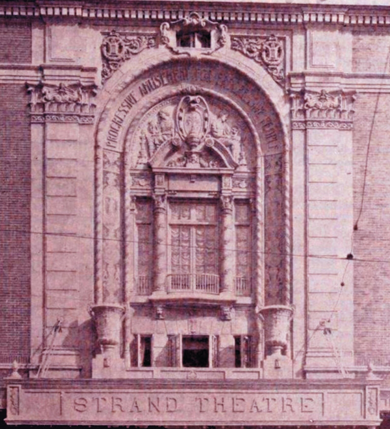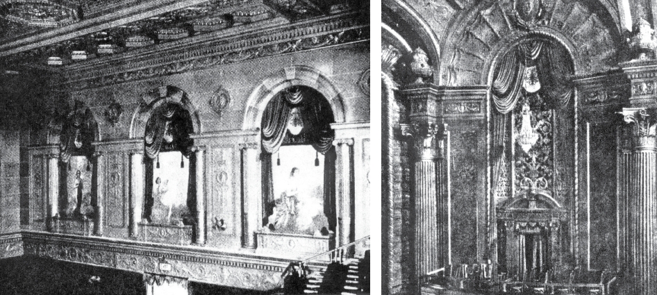 The Strand Theatre boasts several lavish opera boxes for visiting patrons. Its interior features ornate chandeliers and columns.