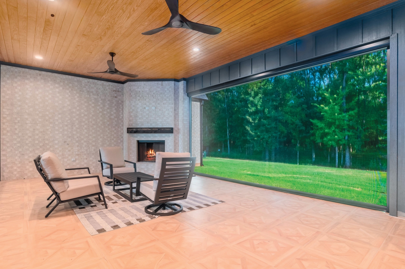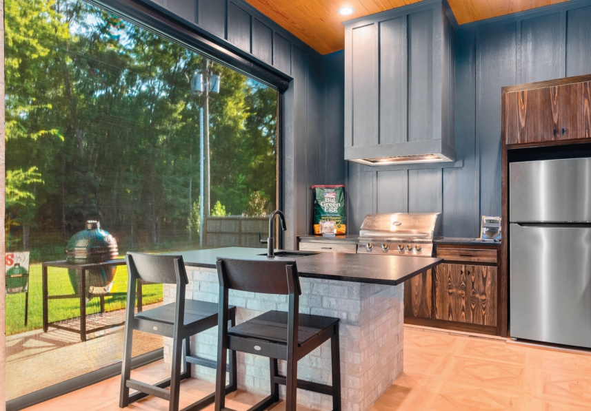 The indoor-outdoor patio design includes automated roll-up screens, furniture from Corner Collection on Line and a Big Green Egg from Tubbs.