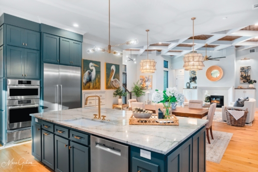 “We’re away from the whites and the greys. We bring in the blues and the greens. There is still some neutral in there. The ceiling has a really cool detail that our framer built into it, and our trim carpenter trimmed out; that’s really something to see. Also, there’s a lot of texture in the house with the lighting fixtures, the wallpaper and different elements of the house.”