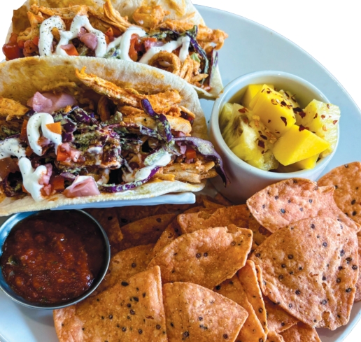 When our food arrived, I could tell we were in for a treat. The presentation of both the tacos and the salad was fantastic. I received two large tacos, filled — and I mean filled — with chicken, peppers and diced tomatoes and drizzled with sour cream. The tacos came with chips, salsa and a serving of pineapple chunks and mangoes.