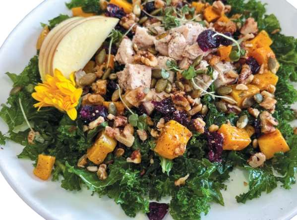 My friend thoroughly enjoyed her salad. As proof, she doesn’t always eat her entire meal. But on this day, she made a happy plate. Her Autumn Harvest Salad was a large serving of kale, topped with hot (not cold) chicken, butternut squash, pecans, pumpkin seeds, apple slices and lemon poppyseed dressing on the side.