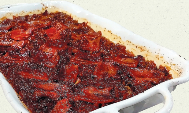 Top with hickory or apple smoked bacon cut in squares.