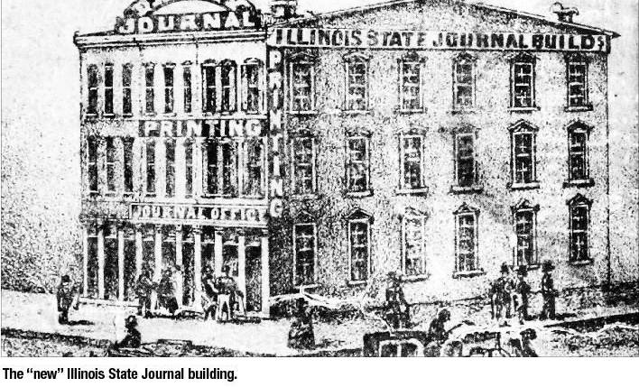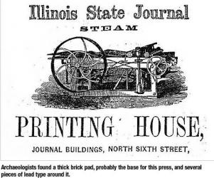 While living in New Salem, young Abraham Lincoln sold subscriptions to the Journal and wrote letters to the editor. After he moved to town in 1837 the budding politician became friends with the editor, also a Whig and later a Republican. Lincoln was a frequent guest in the new Francis home. After Lincoln broke up with Mary Todd in 1841, Mrs. Francis helped them to reconcile, and the couple was married in November, 1842. During the 1840s the Francis family, reflecting rising affluence and new markets to serve a consumer society, got new dishes, plates and glasses. They deposited growing quantities of the old ones — some not even broken — in the privy out back. The publishing business was good for Simeon Francis and his brothers. In 1853, after 18 years at Sixth and Washington, the newspaper moved to new offices a half block north on Sixth, just south of Simeon Francis’s home at Sixth and Jefferson. The building was a large commercial structure with three storefronts, each 20 feet wide, and newspaper offices on the second and third floors.