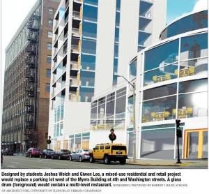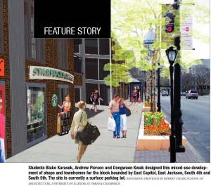 all hallmarks of new urbanism. Still, downtown still seems to be a long way from having the cineplex and swanky nightclubs the students sketched out. Paul O’Shea, the city’s planning and design coordinator, also chairs the R/UDAT follow-up committee and worked closely with Selby’s students on the AIA 150 project.