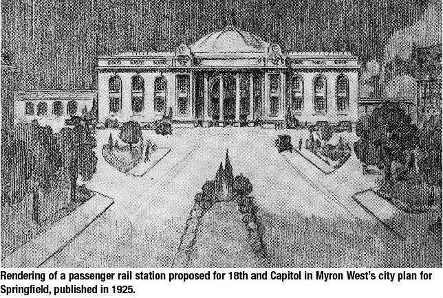 People come to Springfield by rail too. Springfield’s first official city plan, drawn up by Myron West of Chicago’s American Park Builders at the request of a reformist Zoning and Plan Commission in 1924, proposed construction of a new passenger rail station at 18th Street and Capitol. The new facility would replace the two or three rail stations through which many visitors then entered and left the capital city.
