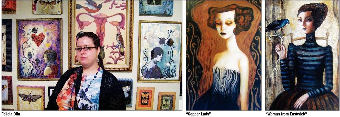 “It’s the most inspiring to see paintings,” she said. “I’m always curious to see what other people are doing.” “Woman from Eastwick,” a piece from “Deviations,” includes earth tones of blackbird blue and brown, with a Victorian feel to the woman’s posture and elegance. The work was inspired by the story The Witches of Eastwick, and is one of Olin’s favorite pieces.