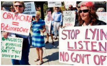 Their talking points (yelling points, actually) were straight out of the litany-of-hokum that Rush Limbaugh, Sean Hannity, Sarah Palin and Co. chant daily — including repetition of the ludicrous lie that Obama intends to deploy cadres of federal death agents to show up at bingo halls to euthanize granny and gramps.