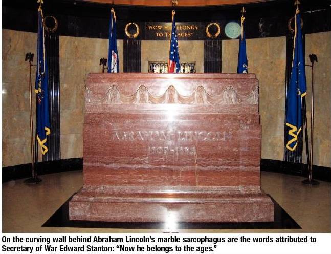 Happily, Whitman’s words do not appear on Lincoln’s tomb. Instead, the frieze overlooking his cenotaph bears the words uttered by Secretary of War Edwin Stanton at the president’s deathbed in 1865: “Now he belongs to the ages.” It is one of the most famous of all epitaphs.