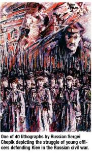 “The main leitmotif of Chepik’s lithographs is the same as in Bulgakov’s novel: the Junkers’ nobility of soul, courage and idealism; the dedication of the youth to the cause of saving their country from the unknown but certainly destructive and terrifying future,” Neginsky says.