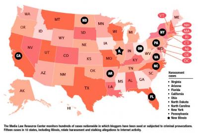 The Media Law Resource Center has already compiled a list of 15 cases nationwide that allege harassment. Some involve requests for restraining orders, as shown in two recent California cases. In San Francisco County, a female online sex columnist filed a request for a restraining order against two individuals after they allegedly sent her threatening e- mails and posted disapproving statements about her on several Web sites. The restraining order was denied. In Shasta County, a reporter for a Redding newspaper requested a restraining order against a former friend, who allegedly ridiculed her on a blog. Her request was also denied.