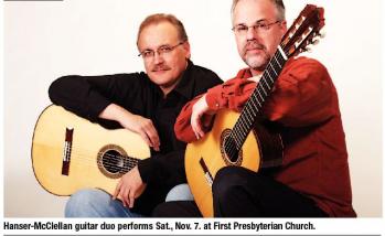 Truly a shining light of our local live music events, the Springfield Classical Guitar Society concerts held at First Presbyterian Church were originated and sustained by our very own classical guitarist guru Russel Brazzel and are vigorously supported by other area enthusiasts of the craft. The group is now into a 12th season of presenting world-class performers at a reasonable price in a beautiful location. The St. Louis-based Hanser-McClellan guitar duo debut the 2009-2010 series this Sat., Nov. 7, followed by Angelo Favis on Jan. 23, John Johns on March 20 and the Millikin University Guitar Ensemble on May 1.