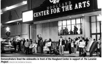 About 300 people filled the sidewalk in front of the Hoogland on Friday evening in support of The Laramie Project. Rev. Martin Woulfe of Springfield’s Abraham Lincoln Unitarian Universalist Congregation helped organize the counter-protesters, urging nonconfrontational tactics to discourage the anti-gay group.