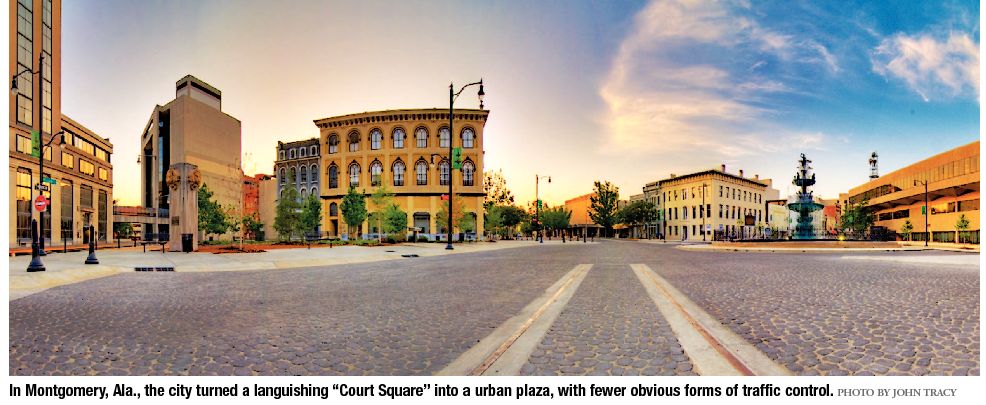 The art is probably most advanced in the Netherlands, thanks to the advocacy of “shared space” concepts by Dutch engineer Hans Monderman. A roadway is not just a separate conduit for traffic but a part of the landscape that surrounds it. Walkers, joggers, cyclists and kids have equal access as motor vehicles. Instead of trusting the traffic engineer, drivers on shared streets must trust their eyes.