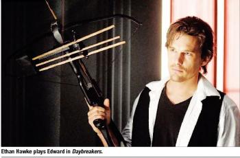 As I walked in to see the Spierig Brothers’ Daybreakers, I thought the last thing I needed to see was another vampire movie. Yet, as the end credits rolled, I was satisfied. Despite its weak third act, the effort manages to put a fresh spin on the world of the undead as it becomes an effective metaphor for our own troubled times. The time is 2019 and a bat-bourne plague has turned 95 percent of the world’s population into vampires. The remaining five percent do their best to stay in at night as they’re hunted down and harvested for their blood. Obviously, the small number of remaining humans and the vast number of vampires ensures the blood supply will eventually run out. The Bromley Marks Corporation charges their top hematologist, Edward (Ethan Hawke), with making a synthetic blood to meet the growing need. Problem is, the scientist sympathizes with the humans and is soon sought by an underground group that hopes he’ll help them with their own cure. The Spierig’s have great fun lampooning our society’s addiction to oil as well as the ramifications of resistance to alternatives. Equally effective is the inversion of our world, in which all normal activities take place at night, an icy-grey-hued world in which vampires go to work and down shots of blood-laden espresso to get through the night. While the directors are adept at delivering an effective social message, taking shots at our social structure and the politics of big business, they also provide blood-soaked thrills that will satisfy horror aficionados. While the film loses steam in the end with its requisite car chases and gunplay, Daybreakers proves the vampire film isn’t running on empty after all.