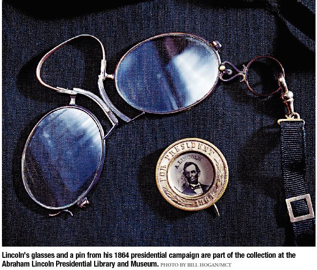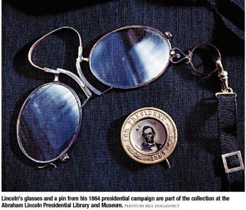 Turning Lincoln stuff into sacred relicsMany years ago, I made my first visit to the Illinois State Historical Library in its handsome but cramped new quarters beneath the Old State Capitol. Having time to kill while waiting for the staff to fetch me a book, I wandered up the stairs to the mezzanine that overlooked the reading room. There, in flat display cases lining the aisle, I noticed a pair of spectacles. The eyeglasses were one of the library’s collection of what are known to fastidious librarians as artifacts, but what most of the rest of the world calls relics, belonging to Abraham Lincoln.