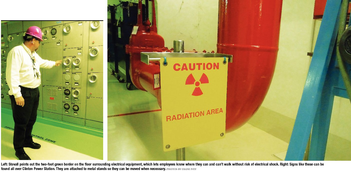 Redundancy (systems of checks, double checks and backups for every visitor, employee and piece of machinery) is emphasized at Clinton Power Station again and again. Redundancy is key, Stovall says, because it ensures safety. Backup generators ensure that everything runs in case of a power outage. On the floor, bright green barriers are painted two feet around all equipment that could potentially give someone an electrical shock. Most doors are interlocking, meaning one must be shut before another can open.