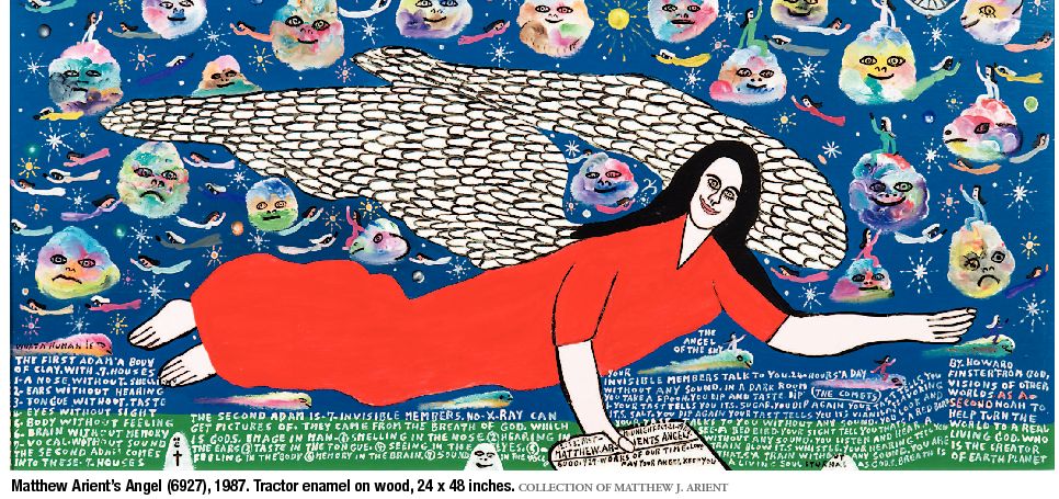 Kudos to the staff at The Krannert for organizing this comprehensive show by one of America’s finest and most prolific primitive artists. Many of the pieces came from the collection of the Arient family of Naperville, who have collected outsider art for some 30 years. Beth and Jim Arient bought their first Finsters in 1980, and developed a strong friendship with Finster and his family.