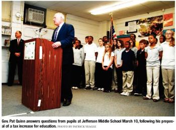 One thing the interviewers returned to again and again was how Quinn’s proposed budget cuts over a billion dollars from education spending. The governor wants to stop those cuts with a one percentage point income tax surcharge. Quinn has warned that, without a tax hike, the schools would suffer. Thousands of teacher layoffs would result. Kids would be put into ever-more crowded classrooms.