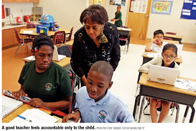 Just as confused is the notion that a more accountable teacher is a better teacher. This misunderstands the nature of good teaching. A good teacher feels accountable only to the child, but her employers expect that she be held accountable to the state, which expects from the child mainly obedience, and the child’s parents, whose expectations are seldom realistic, and whose indifference or incompetence in that role is probably the biggest single obstacle to learning. The Florida scheme not only would have pushed such paragons closer toward the door, it would have given them a kick on the way out.