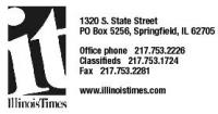 PUBLISHER Sharon Whalen [email protected], ext.137 EDITOR Fletcher Farrar [email protected], ext.140 Letters to the [email protected] STAFF WRITERS Patrick Yeagle [email protected], ext.122 Amanda [email protected], ext.123 EDITORIAL INTERN Diane Ivey ................................................divey@illinoistimes.com CALENDAR COORDINATOR Anita [email protected], ext.143 CONTRIBUTORS Amy Alkon, Julianne Glatz, Jim Hightower, Tom Irwin, Jacqueline Jackson, Chuck Koplinski, Dan Perkins, Rich Miller, John Sherffius, Jennifer Fishburn, Roland Sweet SENIOR DESIGNER Joseph Copley [email protected], ext.125 PRODUCTION DESIGNER David Hine [email protected], ext.124 ADVERTISING Beth Parkes-Irwin [email protected], ext.131 Tia Schoen [email protected], ext.128 Nan Bulli [email protected], ext. 129 BUSINESS/CIRCULATION Brenda Matheis [email protected], ext.134 Published weekly on Thursday. Copyright 2009 by Central Illinois Communications LLC. All rights reserved. Reproduction in any form without permission is prohibited. POSTMASTER: Send address changes to: Illinois Times, P.O. Box 5256, Springfield, IL 62705. SUBSCRIPTIONS: Send $75 a year: (Add $15 per year for overseas delivery.)